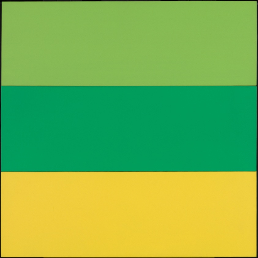 Train Landscape was painted while Kelly lived in Paris. The title derives from a fleeting view he observed from a speeding train: fields of lettuce, spinach, and mustard blurring into great swaths of green and yellow. The work is a triptych of joined panels, with bold, flat color fields that abstract nature into visual rhythm. Rather than a literal depiction, the painting offers a distilled sensation of landscape: shape, hue, and spatial tension become the subject. In Train Landscape, Kelly transforms a passing moment into a stable, meditative object — an exercise in how color and form alone can evoke place, motion, and memory.