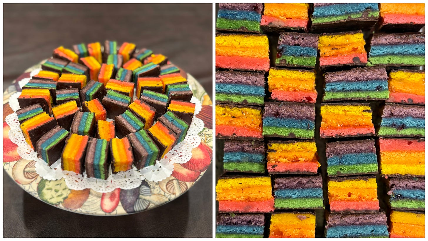 seven-layer rainbow cookies (made by me; recipe from Smitten Kitchen) featuring “ROY” with apricot preserves & “G. BIV” with raspberry preserves